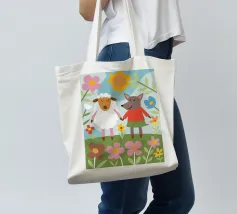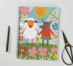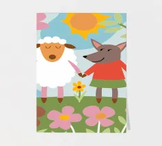 Questa illustrazione unica presenta una pecora e un lupo uno accanto all'altro, raffigurando un'amicizia inaspettata e la bellezza dell'accettazione.