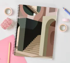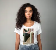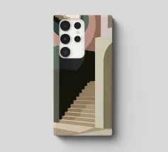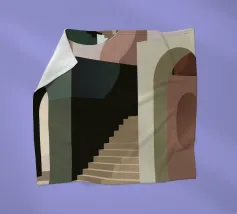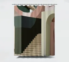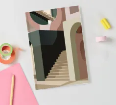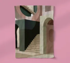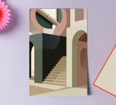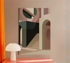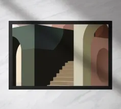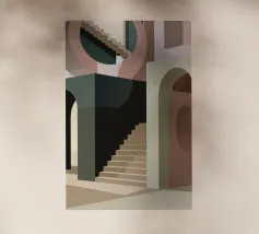 Uno spazio architettonico astratto è definito da una scalinata spoglia e da archi sovrapposti, con un drammatico gioco di luci e ombre che crea una composizione potente e minimalista.