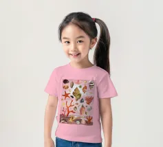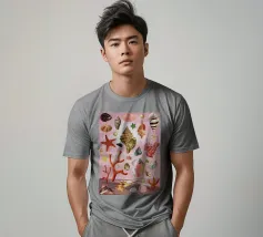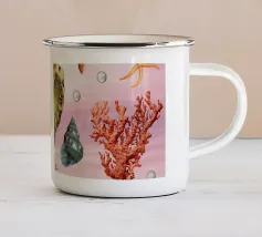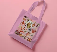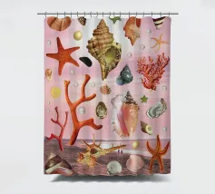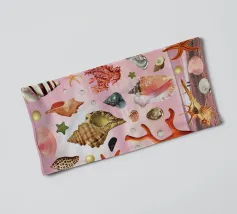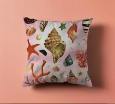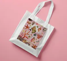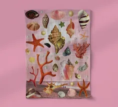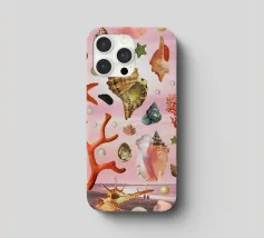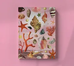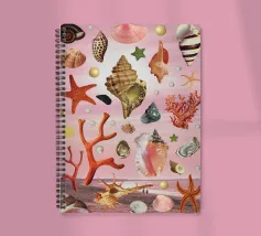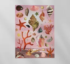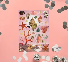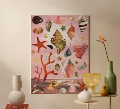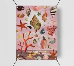 Vintage collection of all types of shells and other bits from the ocean, including pearls, snails, corals, mussels, oysters, etc. over a photo of a pink sunset on the beach. Beautiful nostalgic retro collage by MsGonzalez