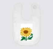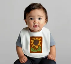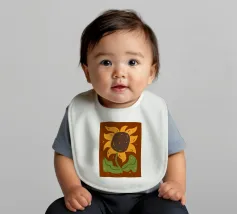 È raffigurato un girasole stilizzato con petali di colore giallo intenso e centro marrone. Foglie e steli verdi aggiungono contrasto ed equilibrio alla composizione.
