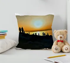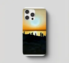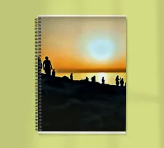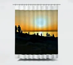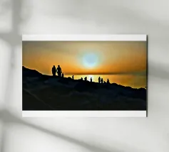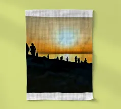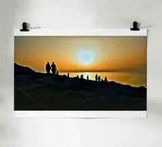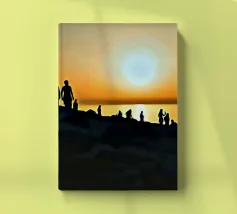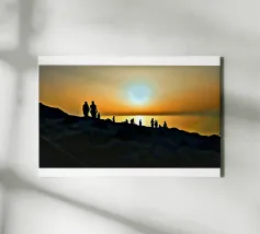 la silhouette di un gruppo di persone sulle rive rocciose che ammirano il tramonto in una giornata estiva.