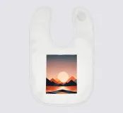 Un dipinto di paesaggio minimalista e geometrico che raffigura un sereno tramonto su un lago tranquillo. La scena è caratterizzata da montagne torreggianti nei toni dell'arancione e del blu, da un grande sole luminoso e da un tranquillo riflesso del cielo sull'acqua. Le linee pulite e i colori vivaci dell'opera creano un senso di pace e tranquillità.