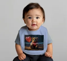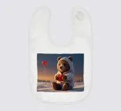 Un simpatico orsacchiotto vestito con un'accogliente felpa con cappuccio siede nella neve, tenendo gioiosamente un cuore rosso mentre un palloncino si muove nell'aria fresca della sera sotto un tramonto colorato.