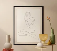Illustrazione minimalista di un cervo, catturato in una forma fluida e astratta. Questa graziosa composizione evoca forza e serenità e si adatta perfettamente a interni tranquilli e contemporanei. Un tranquillo omaggio alla natura e all'eleganza.