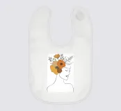 Un disegno al tratto minimalista raffigura il profilo di una donna dall'espressione serena. I suoi capelli sono ornati da grandi fiori stilizzati di colore arancione e giallo e da foglie delicate.