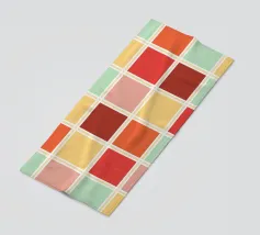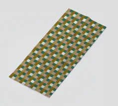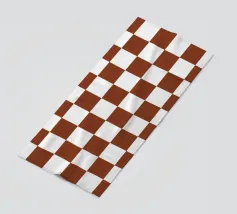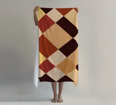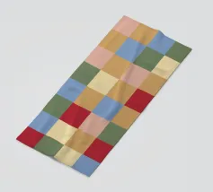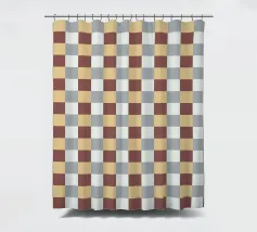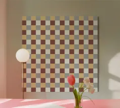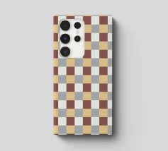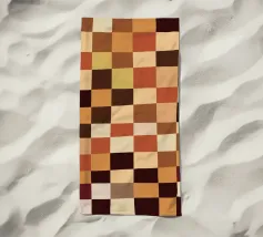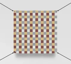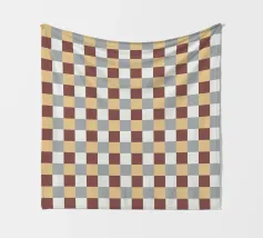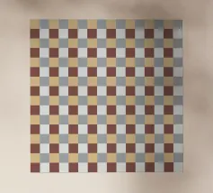 Un motivo di quadrati colorati alternati crea un effetto scacchiera con sfumature di beige, grigio e marrone. Il disegno a griglia è simmetrico e uniforme.