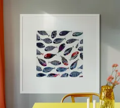 Disegno con pesciolini d'argento e pesci rossi