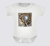 Questa immagine mostra un'intricata architettura circolare con colonne di pietra ornate, una statua centrale e un soffitto di vetro. La prospettiva surreale crea un effetto tunnel, attirando lo sguardo verso il centro della composizione.