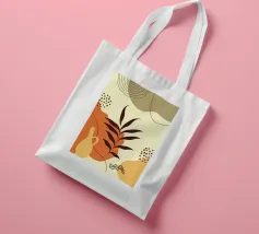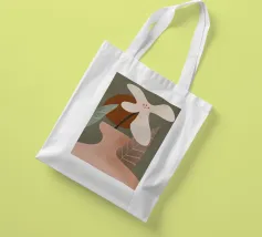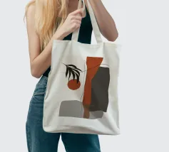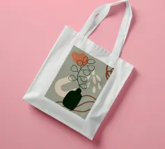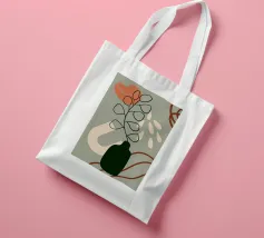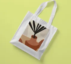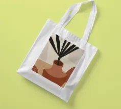 Linee astratte e blocchi di colori tenui creano una composizione moderna dall'estetica minimalista. La forma stilizzata di una pianta e quella semplice di un vaso aggiungono elementi organici, in contrasto con le forme geometriche.