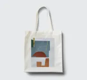 Forme geometriche e tonalità della terra creano un design moderno con linee e forme astratte. La composizione comprende rettangoli sovrapposti e un semicerchio, evidenziati da accenti dorati.
