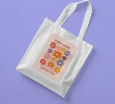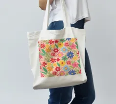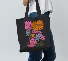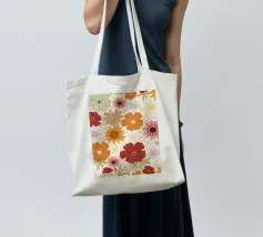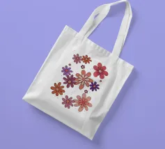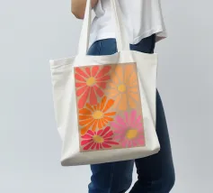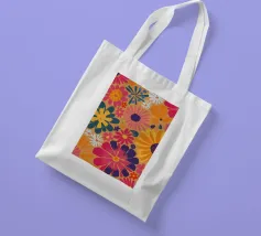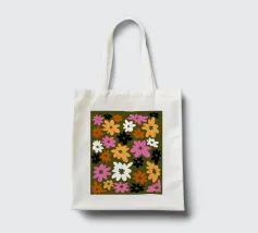Un motivo floreale giocoso che sembra una passeggiata visiva in un festival di giardini retrò: I fiori stilizzati, nei colori arancione, rosa, viola, rosso e giallo, danzano liberamente. Ogni fiore ha una forma semplice, simile a una margherita, con lunghi petali a raggiera che emergono da un punto centrale. La disposizione è volutamente irregolare, come un disegno sparso di gioia, estate e nostalgia.