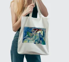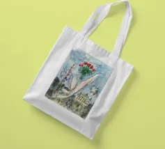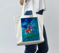 Questa litografia di Marc Chagall illustra una scena biblica, probabilmente raffigurante il re Davide che fugge da una finestra mentre la moglie Michal fa la guardia. Eseguita nella caratteristica tavolozza blu, grigia e bianca di Chagall, cattura un momento di dramma, lealtà e passione. Le figure sognanti e fluttuanti e la semplice ambientazione architettonica trasmettono una narrazione emotiva e senza tempo.