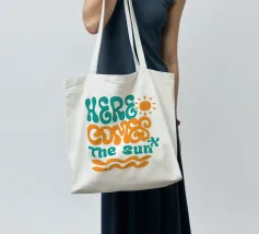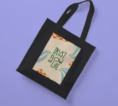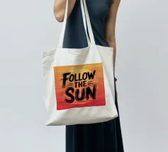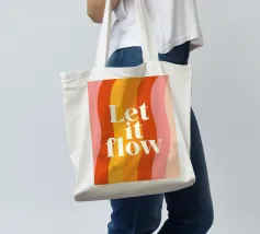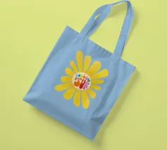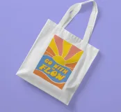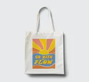 Un motivo solare in stile anni '70: un sole giallo splende in alto con raggi caldi in rosa, arancione e giallo, mentre sotto scorrono onde blu, con la scritta "GO WITH THE FLOW" in un vibrante giallo vintage. Le linee curve e la ricca palette di colori trasmettono leggerezza e una sensazione di spensieratezza estiva. Ottimismo, libertà e relax: un mantra visivo che invita a godersi il momento e ad abbandonarsi al ritmo naturale.
