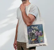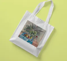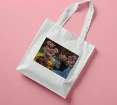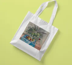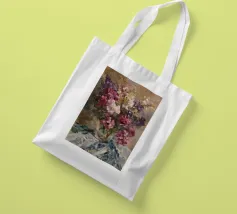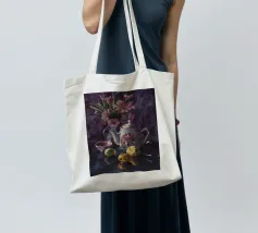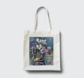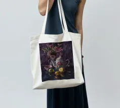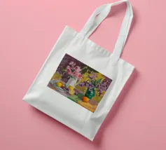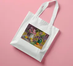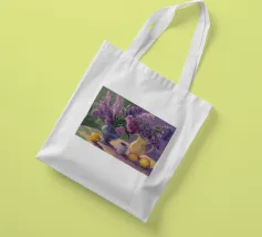 Una natura morta con una brocca d'argento riempita con un rigoglioso bouquet di lillà viola e rosa. Un bicchiere di vino rosso e della frutta si trovano su una superficie scura e lucida che riflette gli oggetti.