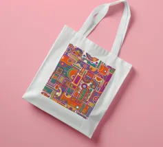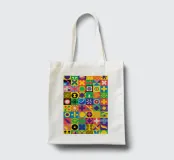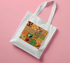 Un motivo complesso e vivace composto da una griglia di piastrelle geometriche, ognuna con un disegno e una combinazione di colori unici, che creano una matrice visiva sorprendente.