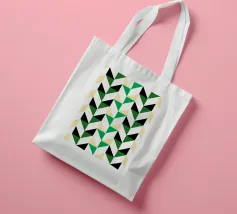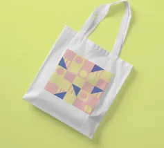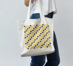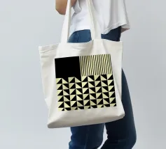 I motivi geometrici si ripetono in un design simmetrico, caratterizzato da triangoli e rettangoli nei colori nero, giallo e rosa. La disposizione strutturata crea una composizione ordinata e di grande impatto visivo.