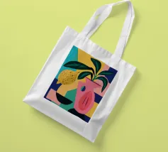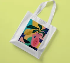 Una moderna natura morta astratta con una pianta stilizzata in un vaso blu, un croissant e forme organiche sotto un sole giallo, il tutto in una composizione equilibrata e calda.