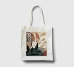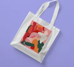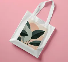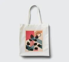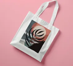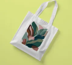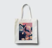 Forme botaniche astratte, tra cui foglie e steli nei toni del rosa, del viola, del blu e del beige, sono disposte su uno sfondo scuro. La composizione è elegante e moderna, incentrata su forme organiche e giochi di colore.
