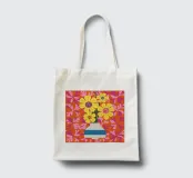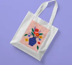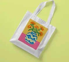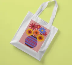 Un vaso a righe bianche e blu contiene fiori gialli e rosa, su uno sfondo vibrante, simile a una trapunta, con motivi floreali rosa, arancioni e rossi.