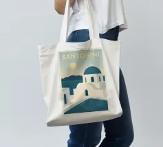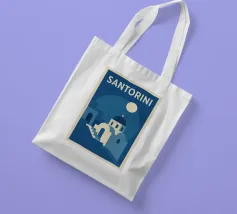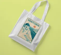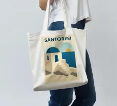 Questo poster vintage di Santorini illustra il fascino unico dell'isola greca con le sue case bianche, la cupola blu e le bouganville in fiore sul bordo del Mar Egeo. Un poster mediterraneo luminoso che invita al viaggio e al relax.
