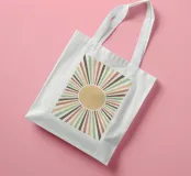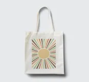 Linee radianti in tonalità terrose come il verde, il marrone e l'arancione si estendono da un cerchio centrale, creando un effetto a raggiera. Il design è caratterizzato da un'estetica retrò con motivi simmetrici e una tavolozza di colori rilassanti.