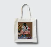 Questa opera d'arte mostra una persona seduta su una sedia a righe, circondata da girasoli e da una borsa verde. Lo sfondo è di un marrone tenue che crea un'atmosfera rustica e riflessiva.