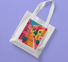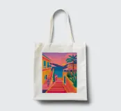 Una vista mozzafiato su una vibrante scalinata mediterranea, fiancheggiata da edifici colorati e palme rigogliose. La prospettiva attira lo sguardo verso l'alto, verso un cielo luminoso, creando un senso di ottimismo, avventura e il sogno di una perfetta fuga estiva.