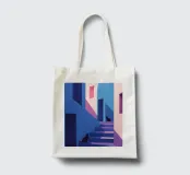 Un'illustrazione moderna e colorata con due gatti neri in un contesto architettonico di vicoli e scale dalle vibranti tonalità di blu e rosa. Il gioco di luci e ombre aggiunge un'atmosfera misteriosa e accattivante, ideale per evocare eleganza e intrigo in uno stile contemporaneo.