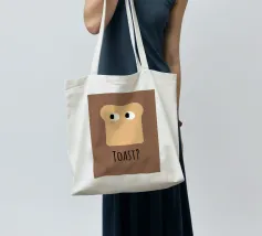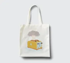 Fette di pane tostato con facce sorridenti fluttuano sopra un tostapane giallo. Sullo sfondo sono presenti testi sul confezionamento, la produzione e la miscelazione, che sottolineano la sostenibilità e il risparmio energetico.