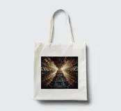 Una rappresentazione surreale di strutture architettoniche simmetriche e torreggianti che convergono verso una luce centrale incandescente. I disegni intricati, l'illuminazione calda e la prospettiva drammatica creano un'immagine impressionante e ultraterrena.