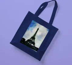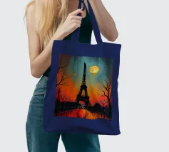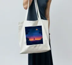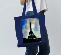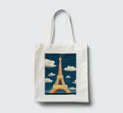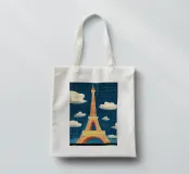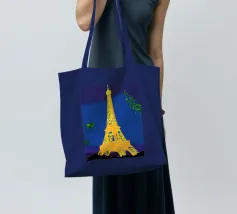 L'immagine mostra la Torre Eiffel in un cielo notturno di un blu intenso, con nuvole bianche, stelle scintillanti e una mezzaluna arancione. La torre stessa risplende nei toni caldi del giallo e dell'arancione e si staglia radiosa sullo sfondo scuro. Lo stile è chiaramente illustrativo e artistico, un misto di romanticismo sognante e colorazione espressiva. Ricorda un dipinto o un poster digitale che enfatizza l'atmosfera e lo stato d'animo piuttosto che la precisione realistica. Un gioco visivamente affascinante tra fantasia e punto di riferimento.