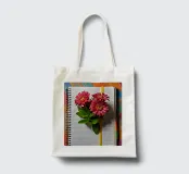 Un taccuino rilegato a spirale presenta tre fiori rosa e foglie verdi, disposti su una superficie di legno colorato, che invitano alla creatività e all'ispirazione.