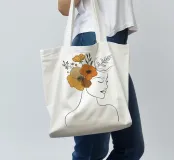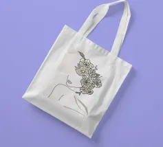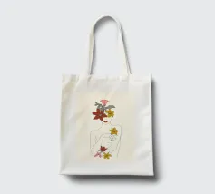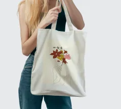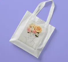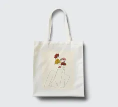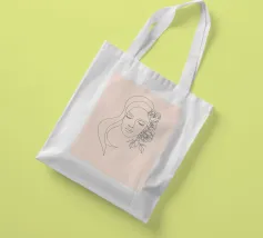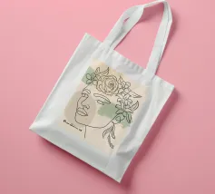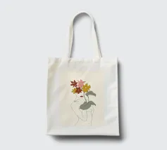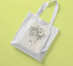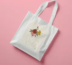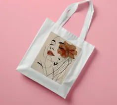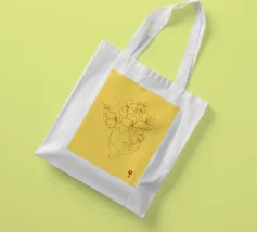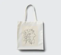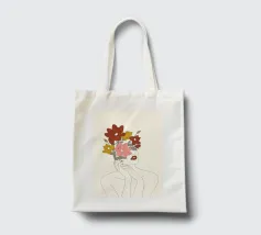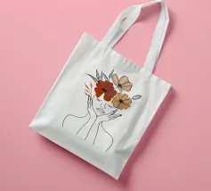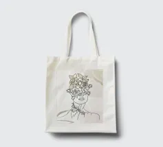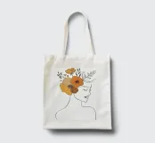 Un disegno al tratto minimalista raffigura il profilo di una donna dall'espressione serena. I suoi capelli sono ornati da grandi fiori stilizzati di colore arancione e giallo e da foglie delicate.