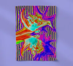 Questo intenso poster fonde estetica glitch, tipografia infuocata e una palette di colori vibranti. I numeri, distorti e aureolati in rosso, arancione, blu elettrico e nero profondo, sembrano fluttuare in uno spazio astratto e saturo di calore visivo.