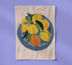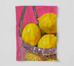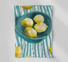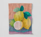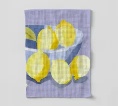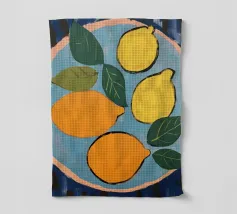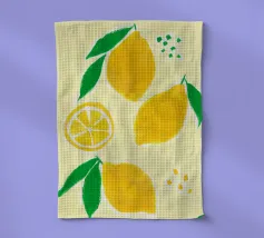 Una natura morta mediterranea con limoni e foglie verdi in tenui colori pastello è presentata in un motivo grafico a quadri. Questa illustrazione di ispirazione vintage dona un tocco di estate tropicale a qualsiasi cucina e celebra la freschezza di frutta e verdura biologica.