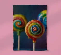 Un vivace mix di caramelle è distribuito su una superficie rosa, che mostra varie forme e colori, tra cui lecca-lecca roteanti e dolciumi rotondi. Questa disposizione giocosa invita a una gioiosa indulgenza.