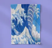 Un'onda alta inghiotte drammaticamente la Torre di Pisa, creando una composizione surreale e dinamica. I blu vividi del mare e del cielo contrastano nettamente con i dettagli architettonici della torre.