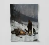 Un suggestivo motivo invernale: un cacciatore si trova con i suoi cani accanto a un falò riscaldante nel mezzo di un paesaggio montano innevato. L'immagine trasmette un senso di avventura, vicinanza alla natura e la tranquilla bellezza dell'inverno. I caldi accenti di luce del fuoco contrastano con il fresco paesaggio innevato e creano un'atmosfera suggestiva. Ideale per murales, tazze, cuscini o tessuti: un disegno unico per tutti coloro che amano l'aria aperta, la caccia, la natura e il romanticismo dell'inverno.