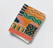 Una composizione astratta verticale con una cascata di forme e motivi colorati e ritmici, tra cui onde, griglie e forme organiche, in una tavolozza di arancione, blu e verde acqua.