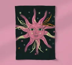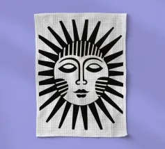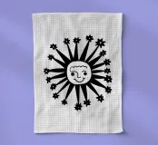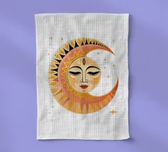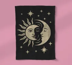 Questo disegno nero e astratto della luna celeste, circondato da stelle scintillanti, conferisce un tocco artistico e tagliente e combina il misticismo del cielo notturno con uno stile contemporaneo e all'avanguardia, rendendolo un pezzo di spicco per qualsiasi spazio e oggetto.