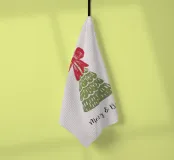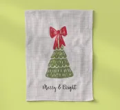 Disegno di un pino verde con neve e un fiocco rosso con citazione di Natale