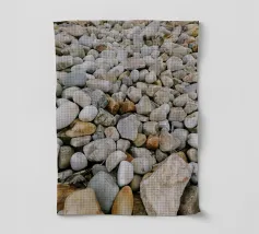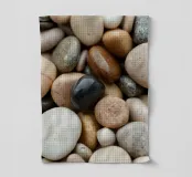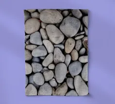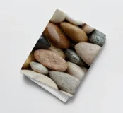 Una varietà di pietre di fiume lisce mette in mostra una serie di colori e dimensioni, appoggiate l'una all'altra. La luce si riflette sulle loro superfici, creando uno spettacolo sereno e naturale.