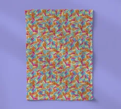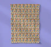Un motivo vivace e colorato presenta una varietà di forme in rosso, blu, arancione e verde. Ripetuto in modo simmetrico, il disegno crea un ritmo visivo accattivante.