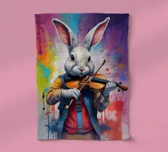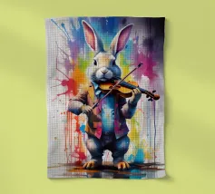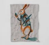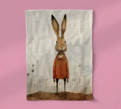 Un coniglio stravagante in plaid si muove con decisione, stringendo una lettera con urgenza surreale.