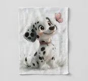 Un simpatico cucciolo di dalmata gioca felice in un prato fiorito, circondato da una farfalla e da fiori in un'incantevole illustrazione ad acquerello.