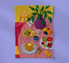 Illustrazione luminosa e allegra di un tavolo per la colazione illuminato dal sole, con caffè, succo d'arancia e pasticcini su un vivace sfondo giallo.