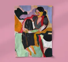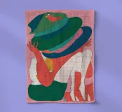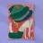 Un ritratto astratto di una donna il cui volto è oscurato da un grande cappello verde e da abiti colorati, che creano un'aura di mistero e intrigo elegante.