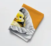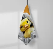 Un simpatico anatroccolo fa capolino da sotto un morbido asciugamano bianco. Le sue soffici piume gialle e i suoi occhi curiosi creano una scena adorabile e affascinante.