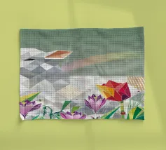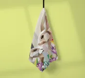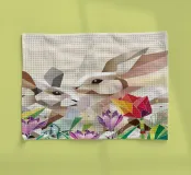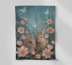 Due coniglietti pasquali stilizzati tra fiori colorati, pulcini e farfalle: un motivo allegro in stile poligonale, ideale per il periodo pasquale e l'inizio della primavera. Due coniglietti geometrici come motivo centrale Fiori primaverili colorati e crochi Inclusi simpatici pulcini e farfalle svolazzanti Design moderno e giocoso per la Pasqua Ideale per prodotti stagionali dal sapore primaverile