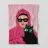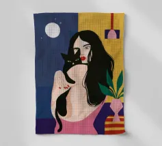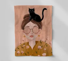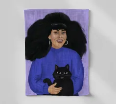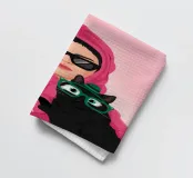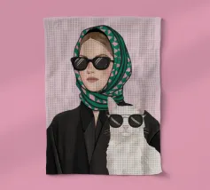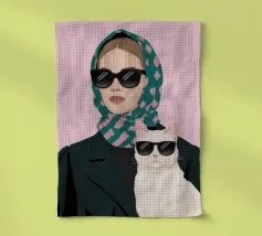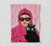 Ritratto chic e misterioso di una donna con felpa rosa acceso e occhiali da sole scuri, che tiene in mano un elegante gatto nero. I colori audaci e l'espressione fredda ed enigmatica creano una dichiarazione moderna ed elegante.